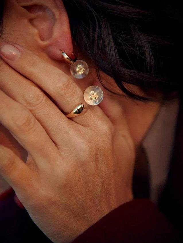 Чтобы сережки не выглядели, как половинки разных пар, мы добавили важный перекликающийся элемент. Присмотритесь: фианит внутри одного стекла повторяет цвет противоположного шарика. Гениально, правда?
