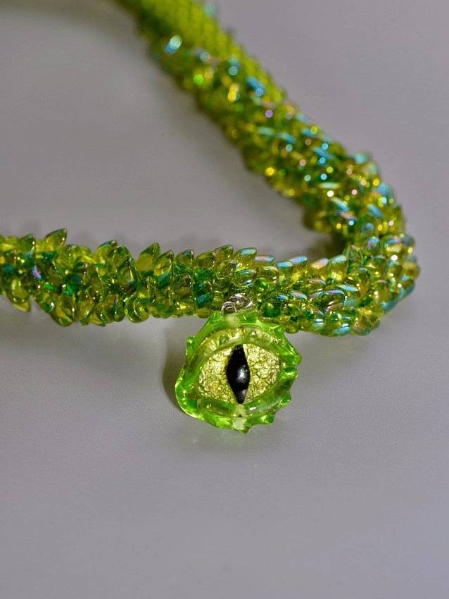 В этой «огнедышащей» линейке мы не изменили себе — это на 100% стеклянные украшения ручной работы. Из муранского стекла мы выплавили завораживающие, до мурашек натуральные «глаза» дракона. Из премиального японского бисера связали крючком «чешую» дракона. Оплетка на сережках выполнена технике мозаичного плетения на шелковой нити.