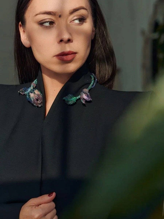 Это колье — словно изысканная цветочная лиана, спускающаяся  из райского сада на плечи женщины. В одном украшении соединены три искусства: живопись, бисероплетение и лэмпворк. Каждый лепесток и изгиб листа созданы по законам света и тени мастером Olafa, прошедшим обучение у русской художницы в Германии.