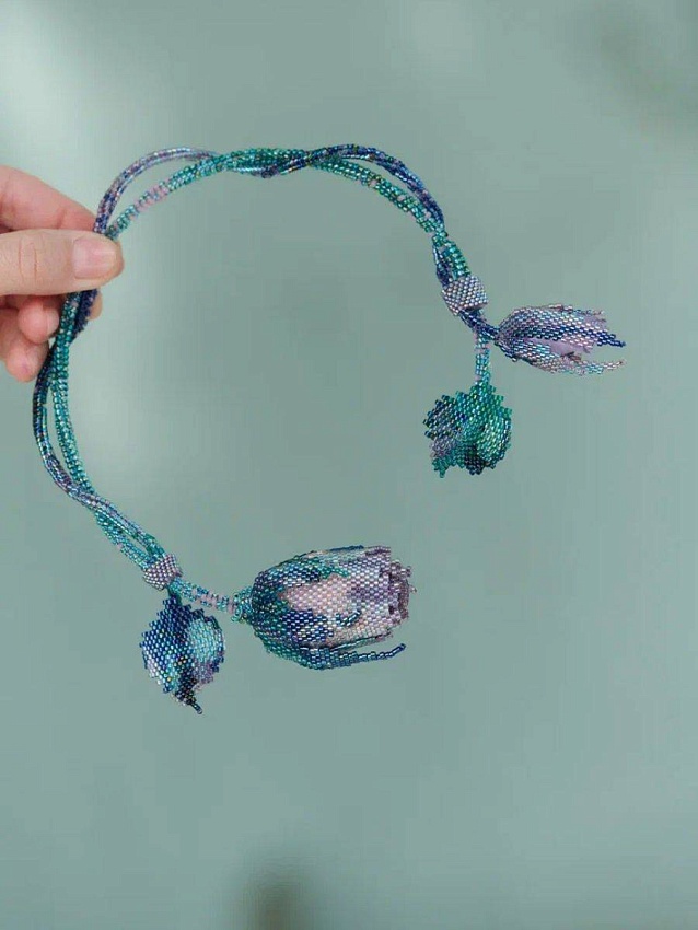 Колье выполнено из 100% стеклянного японского бисера, известного своей чистотой, глубиной цвета и мерцанием. На создание одного украшения уходит две недели неспешной, вдумчивой работы, где каждая бисеринка ложится на своё место — как нота в музыке.