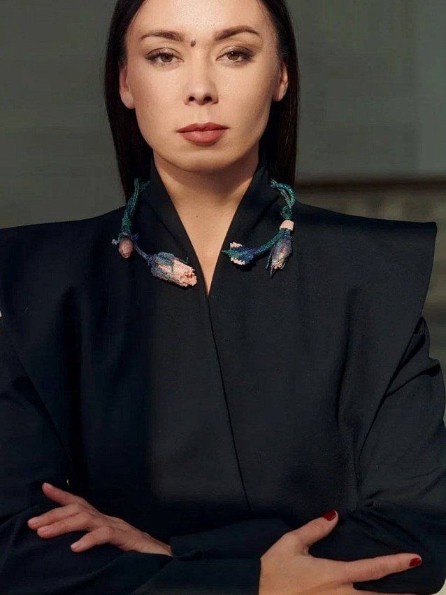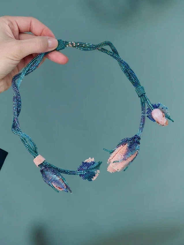 Это колье — словно изысканная цветочная лиана, спускающаяся из райского сада на плечи женщины. В одном украшении соединены три искусства: живопись, бисероплетение и лэмпворк. Каждый лепесток и изгиб листа созданы по законам света и тени мастером Olafa, прошедшим обучение у русской художницы в Германии.