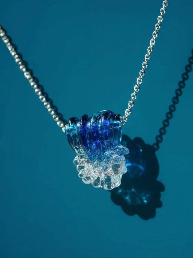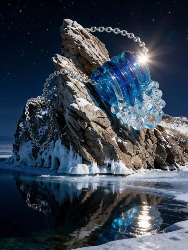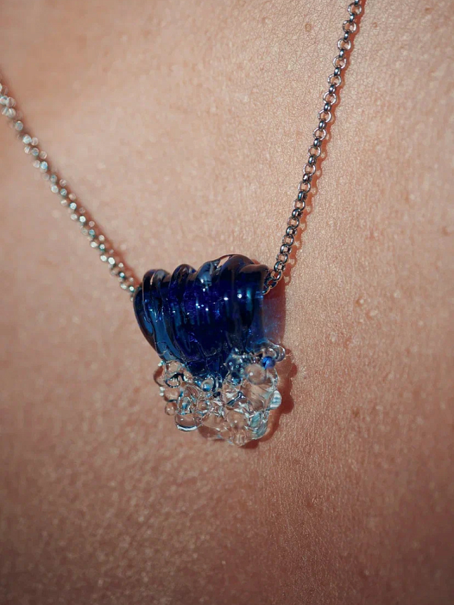 Это украшение родилось в соприкосновении мастера с Байкалом. Во время первого Olafa-тура один из наших лэмпворкеров Яна впервые увидела самое глубокое озеро планеты. «Байкал встретил меня грозой, ветром, ливнем и большими волнами! Сила, мощь, энергия очень впечатлили! Потом я видела Байкал и в солнечную погоду, и в ветреную, и в спокойную на рассвете. И всегда вода поражала суровой красотой, завораживающей синей глубиной». Все эти ощущения и характер Байкала мастер решила передать в стекле, а точнее в волне Байкала: глубокий синий, преломляясь на свету и играя лучами, дает ощущение той самой прохлады и свежести, а динамичная форма подчеркивает мощь стихии.