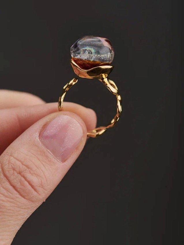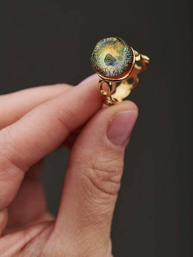 Это дуга из латуни, «обнимающая» палец. Внутри — светящееся стекло, которое заряжается от тепла кожи. Не просто украшение, а тихий диалог с собой: «Ты не одна. Ты — целая Вселенная». Иногда самое важное объятие — то, которое ты даришь себе.