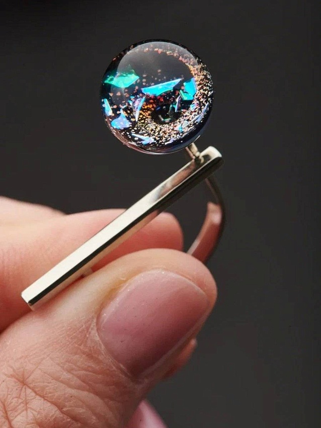 Это стекло выстелено внутри искрами огня и инкрустировано осколками изумрудного льда. Вместе они создают эффект 3D-галактики, у которой нет ни края, ни дна… Кольцо «Пламенный лед» — это две стихии, которые соединяются в одном украшении.