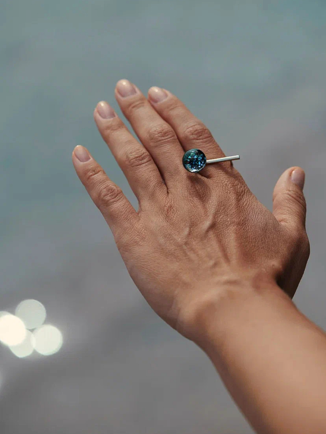 Космический шар помещен на самый край геометричного кольца, что создает асимметрию и подчеркивает невесомость стекла Olafa.