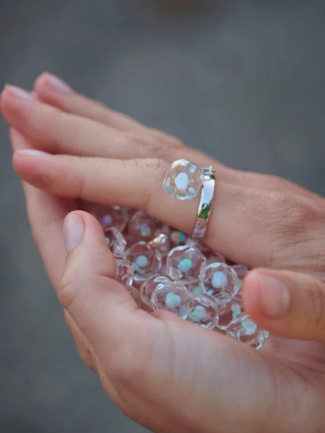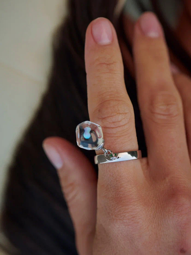 Для тех, кто идет против правил и не выносит строгих форм, мы создали сумбурное кольцо «Сияние». Упругое боросиликатное стекло мы огранили абсолютно хаотично! Оставили его прозрачным, чтобы можно было разглядеть все грани и опал внутри.