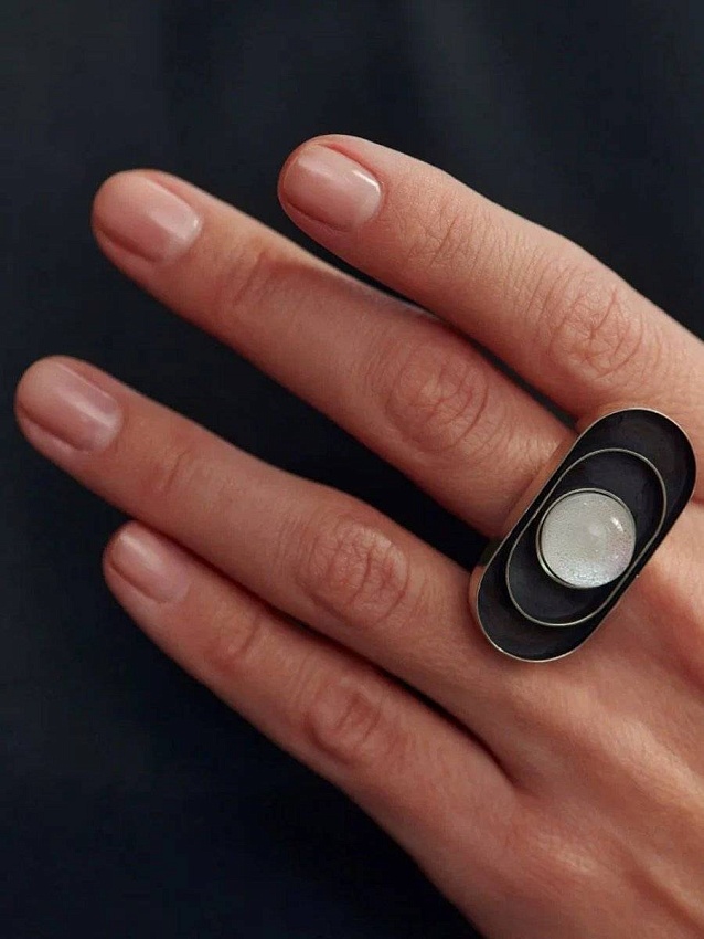 Контраст нежности и строгости. Ослепительное, искрящееся на свету снежное стекло и многослойная оправа из брутального мельхиора. Это похоже на свидание двух противоположностей, которые непременно притягиваются и идеально подходят друг другу. За счет базовых оттенков это украшение может стать классикой вашего ювелирного гардероба.