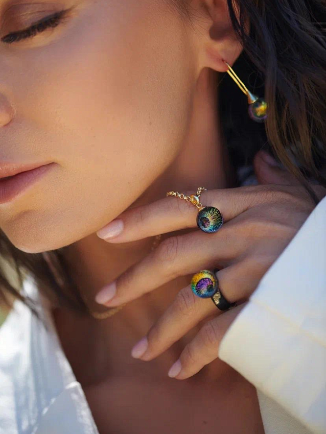 Эффектное керамическое кольцо с гладкой, как шелк, поверхностью и крупной вставкой из стекла ручной работы.