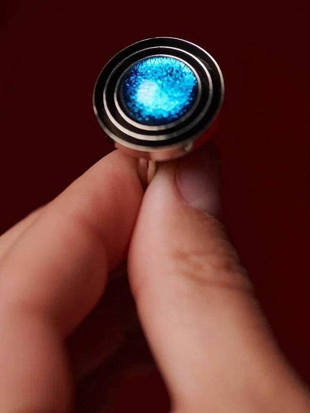 Лазурное стекло с солнечными бликами передает невероятный цвет воды, а многослойная 3D - оправа из мельхиора служит ему углублением и напоминает вулканический кратер.