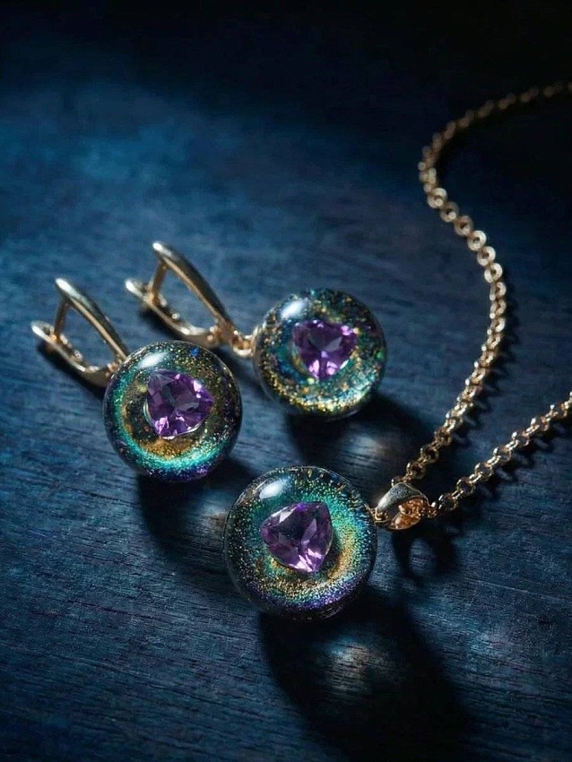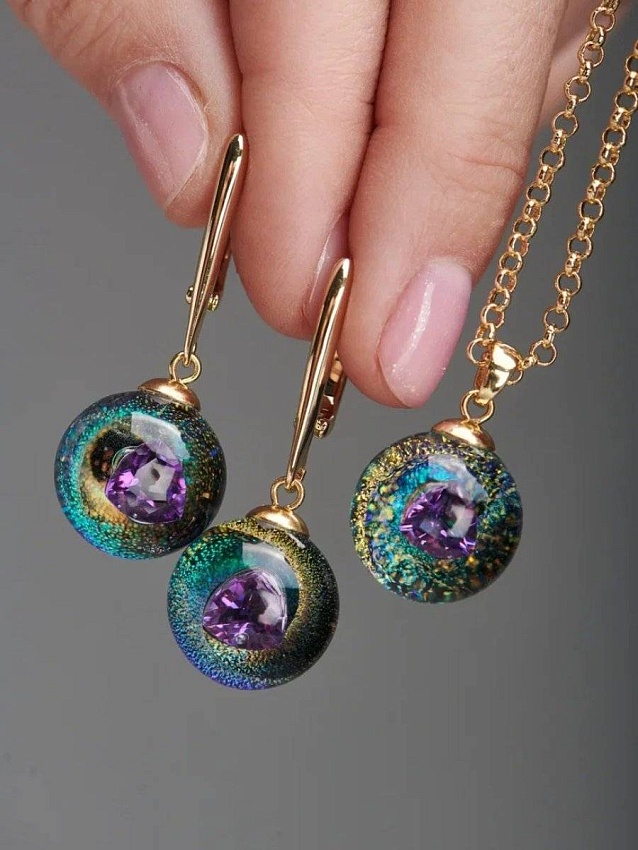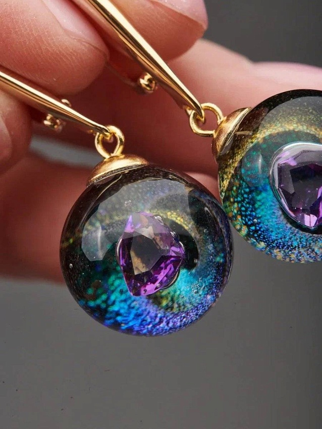 Вставлять яркий фианит в яркое стекло — это как ходить по лезвию ножа. Есть риск переборщить и всё испортить. Но мы умеем нащупать тонкую грань между «wow» и «too much». Секрет гармонии этих серёжек — в изобилии цветов. Если смешать все оттенки, которыми переливается стекло, то получится не что иное как фиолетовый фианит. Он и есть квинтэссенция этих серёжек.