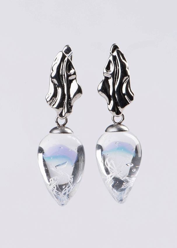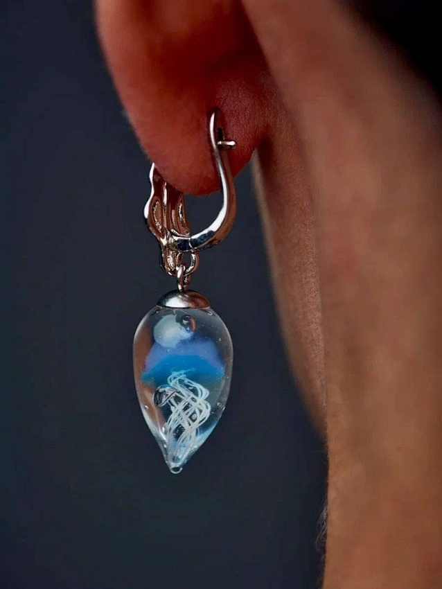 На три вещи можно смотреть бесконечно: огонь, воду и сережки-медузы от Olafa. Чудо природы, воссозданное в стеклянном куполе. Невесомые, хрупкие, чарующие. Наглядный пример того, насколько заметным и ярким может быть прозрачное украшение. Чтобы ещё больше подчеркнуть в нем стихию воды, мы использовали волнообразную, «стекающую» фурнитуру.