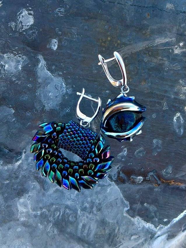 В этой «огнедышащей» линейке мы не изменили себе — это на 100% стеклянные украшения ручной работы. Из муранского стекла мы выплавили завораживающие, до мурашек натуральные «глаза» дракона - "Драконы иссиня-черные". Из премиального японского бисера связали крючком «чешую» дракона. Оплетка на сережках выполнена технике мозаичного плетения на шелковой нити.