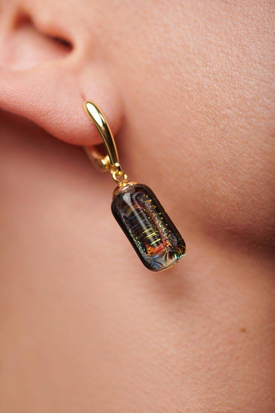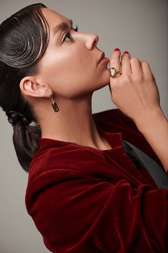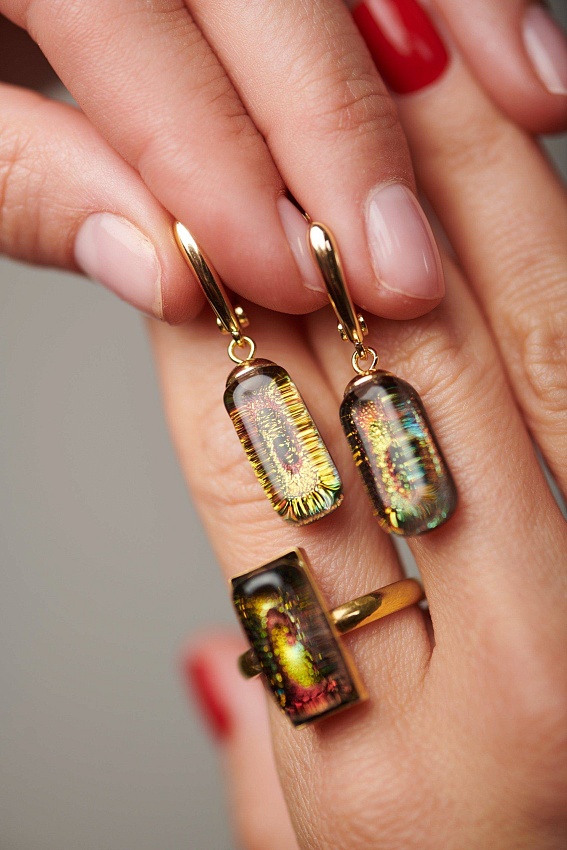 Глубокие стеклянные вставки словно хранят внутри россыпь разноцветных огней — золотых, изумрудных, рубиновых. При движении они вспыхивают и переливаются, как ночной мегаполис, полный энергии, музыки и тайных историй.