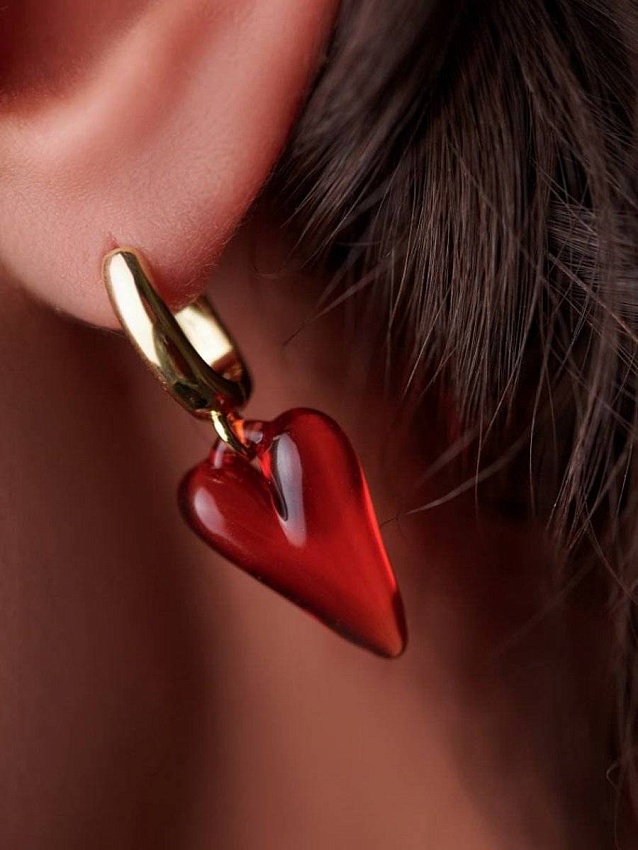 Украшение, от которого сердце забьется чаще! Кроваво-красное стекло и самая трендовая на сегодня форма украшений. Сердечки целиком выплавлены из стекла и дополнены удобной золотистой оправой. Если хотите признаться в любви кому-то или себе — эти серьги скажут все за вас.