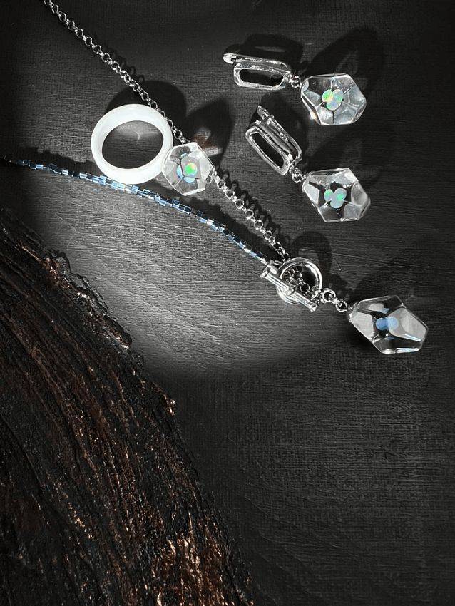 Три отличительные особенности новой коллекции: прозрачное стекло, опалы и грани.