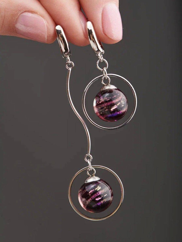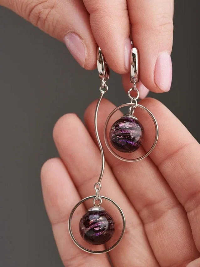 Опьяняющая красота стекла! Асимметричные серьги в глубоком виноградном оттенке, который оживает на солнце малиновыми отблесками. Благородный цвет мы намеренно разбавили дерзкой формой: асимметрией и разноуровневым расположением шариков.