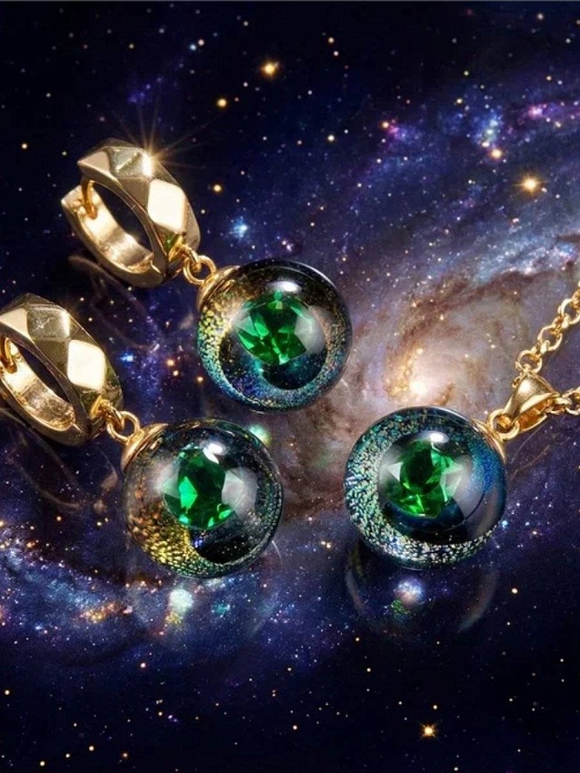 В эпицентр каждой бусины ультразелёный фианит, от которого во все стороны разбегаются заряженные частицы.