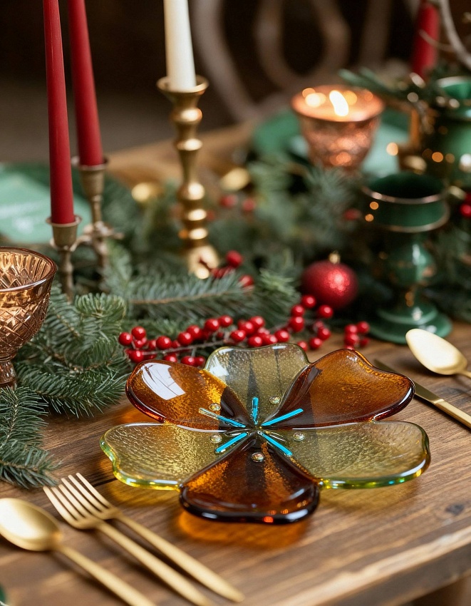 Праздничные блюда выполнены в техниках ресайклинга и фьюзинга — переработки и спекания стекла. Ручная работа и наш авторский дизайн. Такой посуды точно не будет ни у кого!